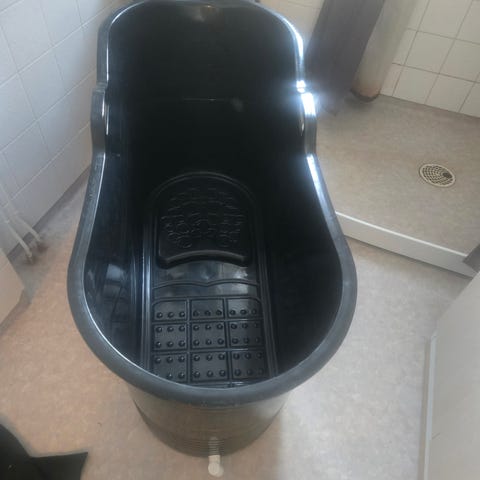 Sparsamt använd vikbar badbalja för vuxna. Fällbar för smidig förvaring. Mått, uppvikt: 128×60×53 cm. Nypris: 1 495 kr.
