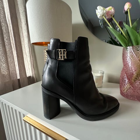 Tommy Hilfiger stövlar i storlek 38, tillverkade i svart läder. Stövlarna har en medelhög klack och detaljer med Tommy Hilfiger-logotyp. Passar för vardagligt bruk och olika tillfällen.