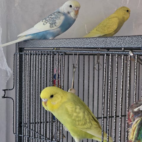 Tyvärr behöver vi sälja våra fina undulater kiwi och iwi pågrund av tidsbrist (hanar) vi vet tyvärr ej hur gamla dom är men är max 1 år, behövs säljas tillsammans för att det är så det alltid har varit och behövs fortsätta så. Dom är vana vid barn och älskar och sjunga.
