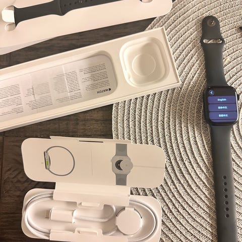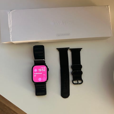 Apple Watch Series 5, GPS, 40 mm, rymdgrå med svart läderarmband. Originalarmband i svart är oöppnad. Levereras med laddare och adapter. Hörnen är lite repiga, se bild.