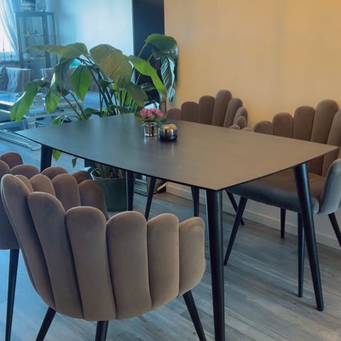 Matgrupp med 1 bord och 4 stolar. Bordet har pulverlackade metallben och en bordskiva i folierad MDF. Matgruppen innehåller 4 stolar med metalben och en sits med skumfyllning och sammetsklädsel. Mått för bordet: Höjd 75 cm, Diameter Ø 110 cm. Mått för stolarna: Höjd 85 cm, Bredd 44 cm, Djup 54 cm.