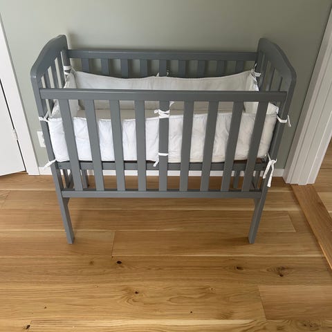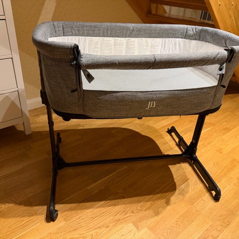 JLY barnsäng av typen bedside crib med ljusgrått tyg. Designad för att placeras intill föräldrasängen för enkel åtkomst till barnet under natten.