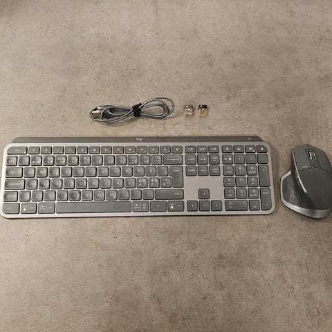 Logitech MX Keys tangentbord levereras med trådlös anslutning, bakgrundsbelysta tangenter och USB-mottagare. Tangentbordet har en kompakt design med svarta tangenter och är anpassat för effektiv användning vid skrivbordet.