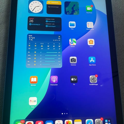 En jätte fin iPad som är köpt november 2024. Använts väldigt lite av mig mest för o rita. Små tunna repor på skärmen finns men minimalt, jätte svårt att fota de. Baksidan kan ha väldigt tunna nästan osynliga repor. Kunde inte hitta nåt på ramen. Funkar precis som den ska.