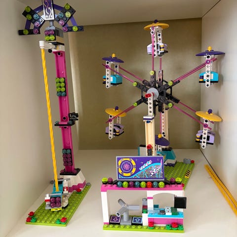 LEGO Friends nöjespark set med flera attraktioner och spår för tåget. Setet innehåller olika karuseller och tillbehör i färgglada färger, designat för barn och samlare.