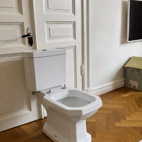Den är använd men i fint skick förutom att det finns en spricka i sitsen som gör att mjukstängningen inte funkar som den ska. (syns på sista bilden)