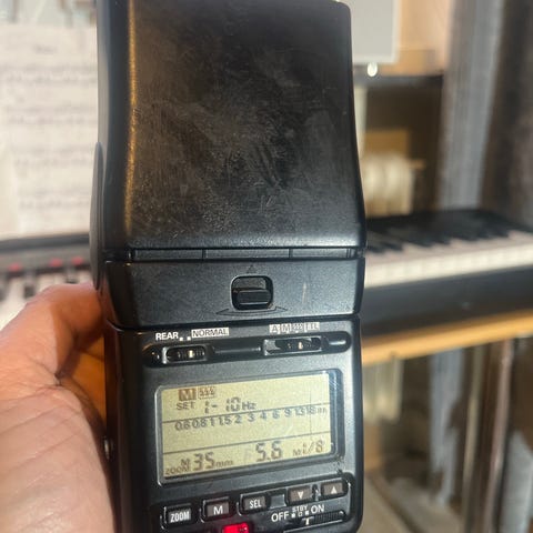 Nikon Speedlight SB-600 digital studioblixt med inbyggd LCD-display och flera kontrollknappar för justering av blixtinställningar. Används för att ge extra ljus vid fotografering och kan monteras på kamerans blixtsko.