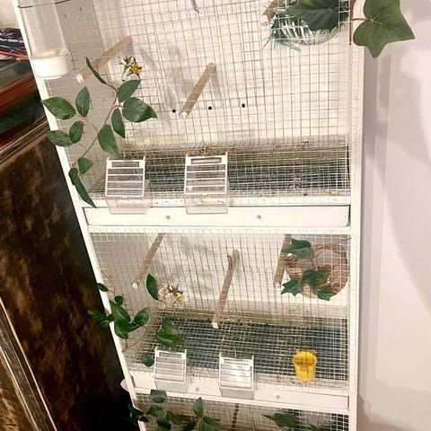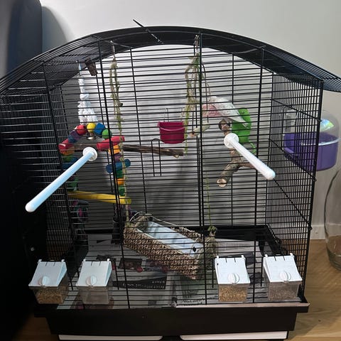 Säljer en fin och praktisk fågelbur som passar för mindre fåglar. Perfekt för dig som vill ha ett färdigt startpaket.