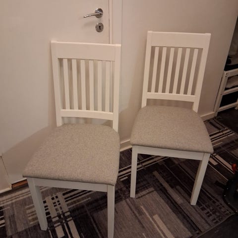 Melltorp vitt bord från Ikea 125×75cm i bra skick. Samt 2 fina vita stolar med träsits i ek. Cirka bredd:45cm Djup 49cm och höjd 94cm. Pris vid köp av bord:250kr samt bara de 2 stolarna 200kr.