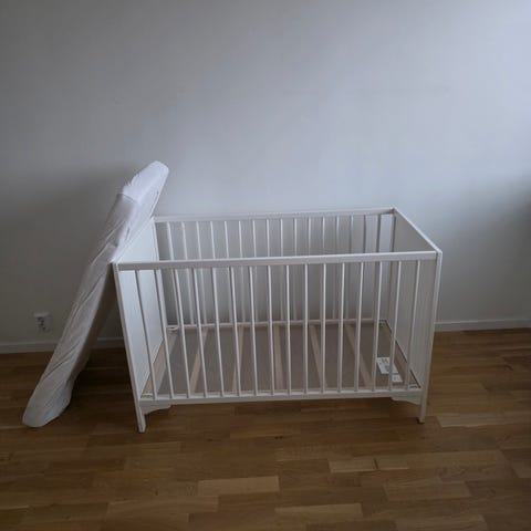 Spjälsäng - oanvänd. Med tillbehör: Grindskydd & Madrass.