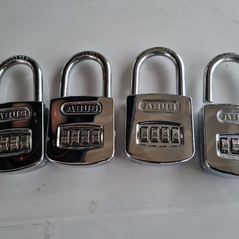 ABUS 160/50 är ett kombinationslås med fyra rullar för fyrsiffrig kod som kan väljas fritt.