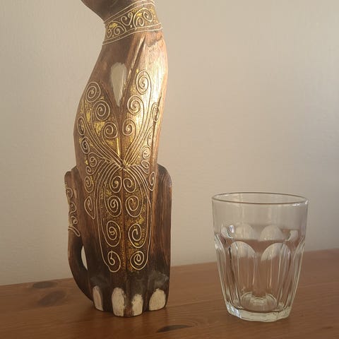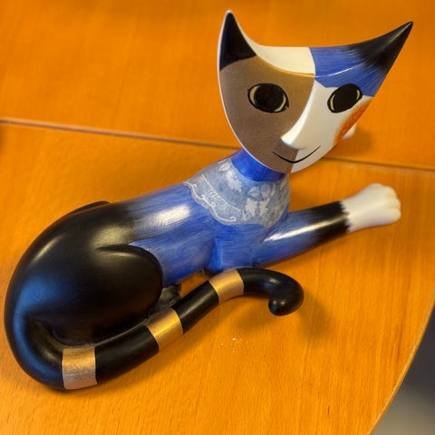 Keramisk kattfigur med handmålade blommönster i grönt och blått. Dekorativt föremål med detaljerad design, lämplig för inredning. Askkopp
