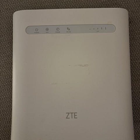 ZTE Router i vit färg med strömadapter. Enheten har portar för nätverksanslutning och en reset-knapp. Används för trådlös nätverksanslutning.