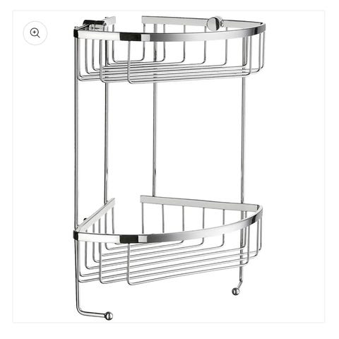 Ny dubbel hörnduschkorg i oöppnad förpackning säljes. Med andra ord oanvänd. Hyllan är tillverkad av massiv mässing vilket betyder att du inte behöver oroa dig för rost.