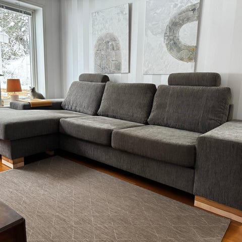 Härlig divansoffa i grått mönster där det finns plats för många. Högra delen mäter 225cm och den vänstra 165cm. Båda delar är 90cm breda. Sitthöjd 43cm och rygghöjd 85cm. Soffan går att dela i tre delar för att underlätta transport.