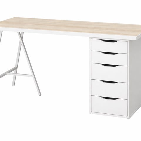 Hörnskrivbord med lådhurts på hjul.