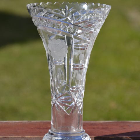 Kristallvas med detaljerad mönstrad design och klar glasstruktur. Vasens form är avsmalnande med en bred öppning och en stabil bas med stjärnmönster. Passar för dekorativa ändamål och för att hålla snittblommor.