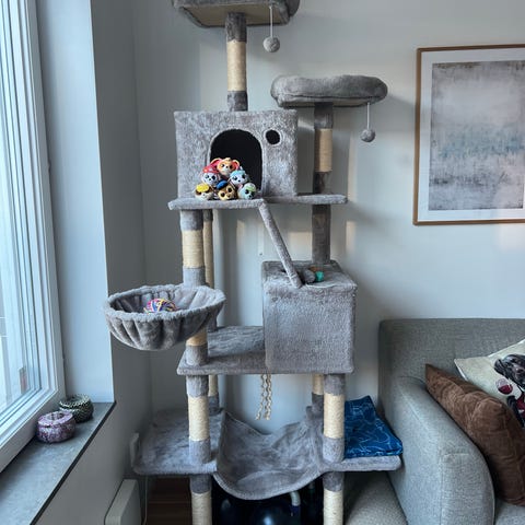 Kattklätterträd med flera plattformar, hängmattor och klöspelare.