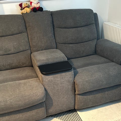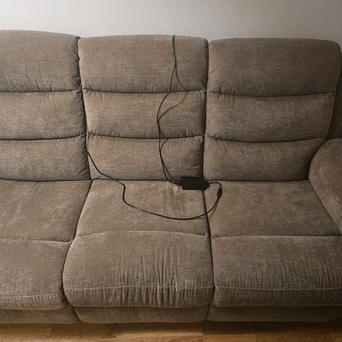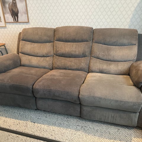 Säljer en 3-sits soffa från Mio med manuell recliner på båda ytterplatserna.