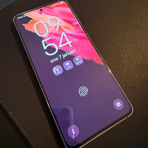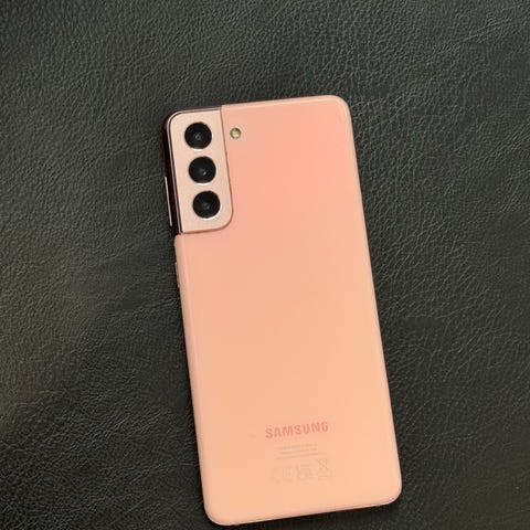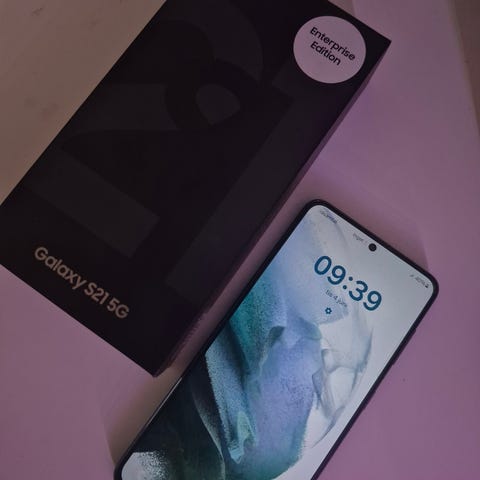 Samsung Galaxy S21 5G smartphone med 128 GB lagringsutrymme i vit pearl.