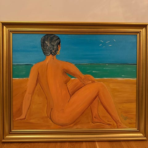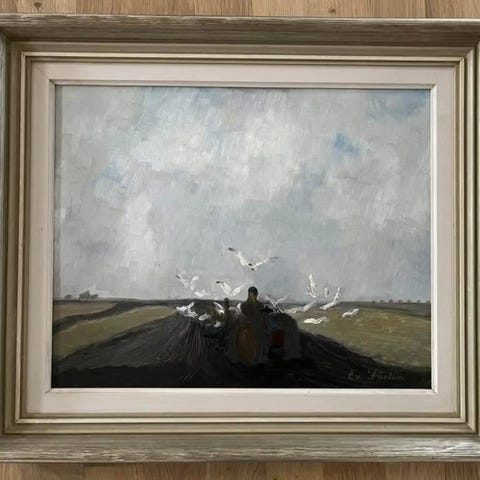 Bildmått 60x60 cm. Johannes Obel (född 1932) Johannes Obel föddes i Sakskøbing, Danmark. Under åren 1950–52 studerade han först hos Emma Svedemann och senare hos Elof Risebye, som var välkänd som “sorgens målare”. Han debuterade som konstnär på “Kunstnernes Efterårsudstilling” 1957 och etablerade sig snabbt med utställningar i både Danmark och utomlands. Obels konst kombinerar figurativa element med subtila inslag av abstraction och stilisering. I många verk återkommer fantasifulla varelser och fåglar med mänskliga attityder i hans färgstarka kompositioner. Under 1950–60‑talen var han särskilt aktiv med abstrakta oljemålningar i en mid-century modern- eller geometrisk stil.