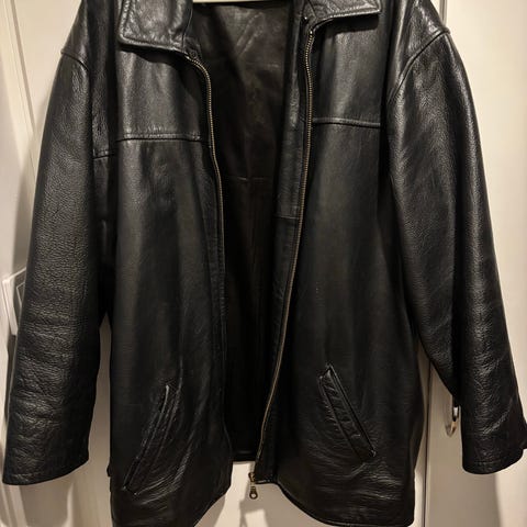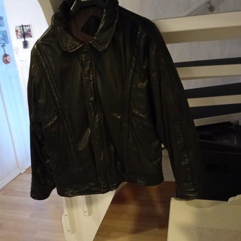Välanvänd läderpaj av äldre modell, 80-tal eller tidigare. Finns lite hål som lätt lagas men håller många år till. Vinterfodrad. Jackan är helt omärkt så vet inte storlek. Ca S-M till man, ca M-L till kvinna.