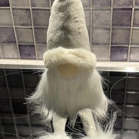 Tomte med gråmönstrad luva och hängande ben. Ca 19 cm hög. Benen är 11 cm långa. Tyngd i botten så att tomten sitter stadigt. Kan hämtas på Fridhemsgatan vid Fridhemsplan.