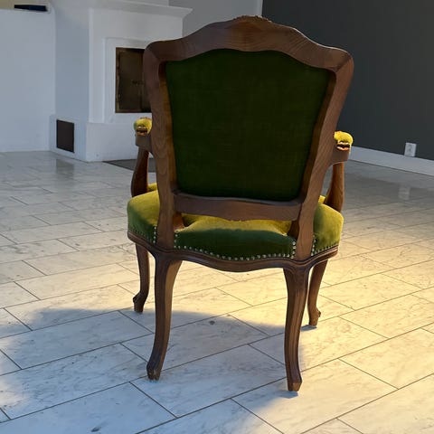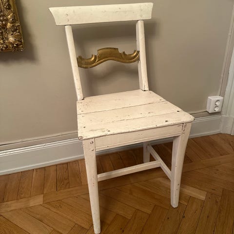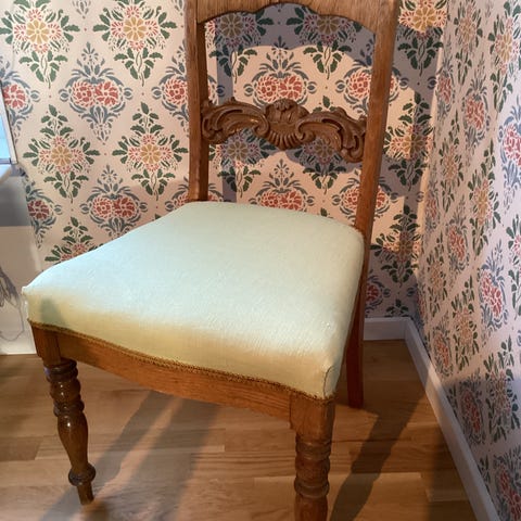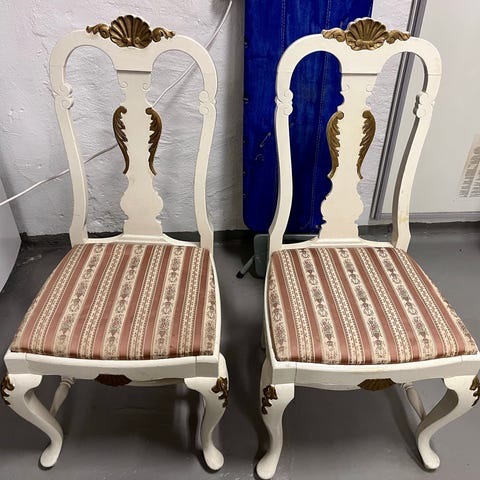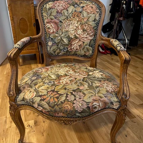 Antika karmstolar i barack tillverkad i trä med snidade detaljer och klädd med blommigt tyg. Stolen har en robust konstruktion och är lämplig för användning som sittmöbel i hemmet.