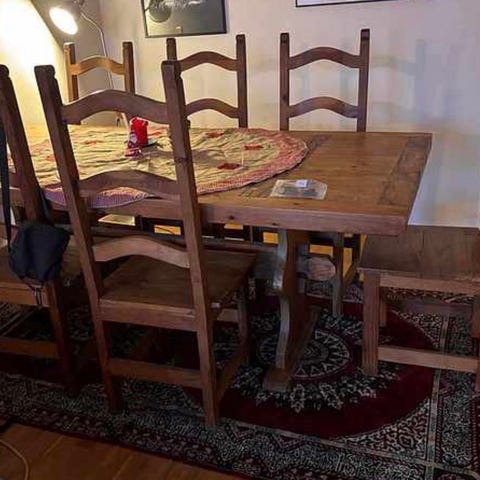 Matbord i massiv trä. Bordet är stabilt och rejält, med kraftiga ben som ger en rustik och tidlös känsla. Vi har målat det svart, men det går enkelt att slipa för att framhäva träets naturliga struktur och skapa den stil man själv önskar.