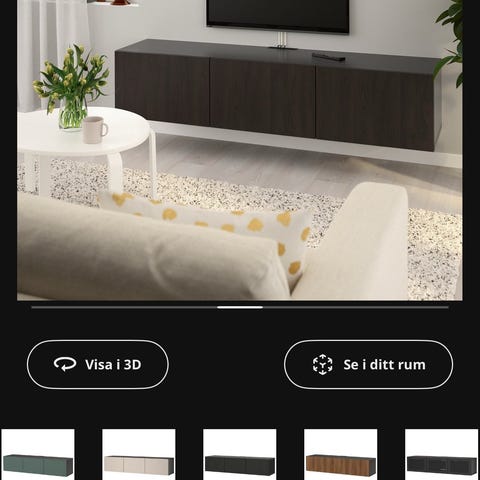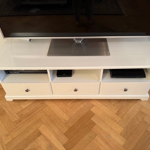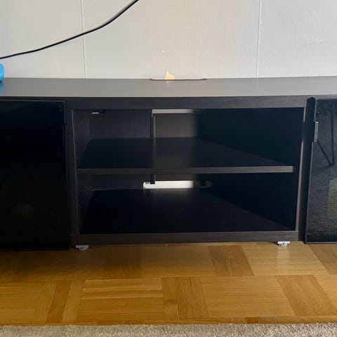 IKEA TV-bänk med två dörrar och förvaringsutrymme. Möbeln har mindre ytliga skador på ytan och kan användas för att förvara elektronik, böcker eller andra hushållsartiklar.