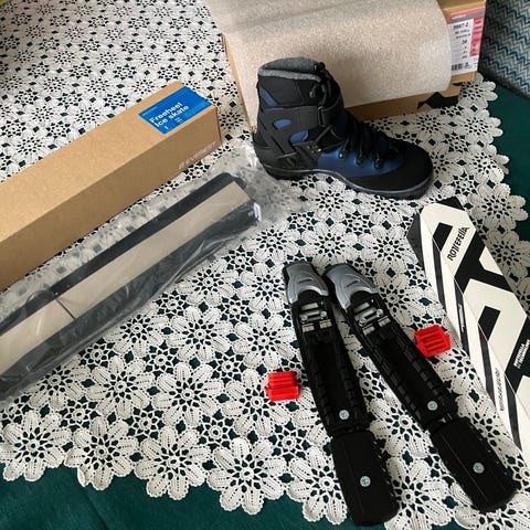 Ny bindning i kartong, tänkt för att konvertera ett par långfärdsskridskor till frihäl men passade dessvärre inte. Köpta i oktober men saknar kvitto och kan ej återlämnas till butik.