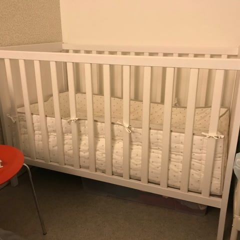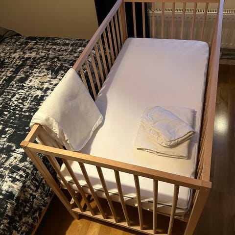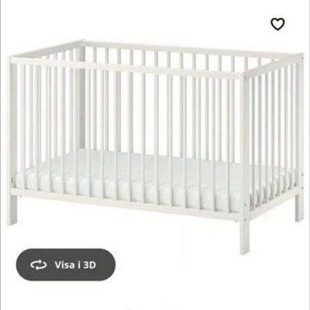 Fyra små hål på ena kortsidan. Se bild. Madrass från IKEA ingår, modell Krummelur, alltid använd med madrassskydd.