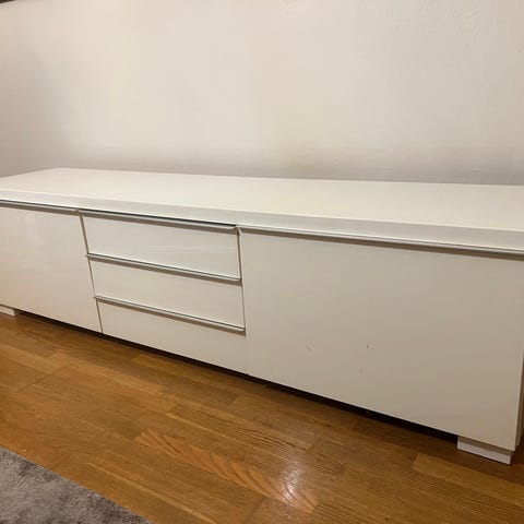 TV-bänk IKEA Bestå i beige/vit utförande med glasskiva + fyra ben. Finns även fästen baktill för att hänga på väggen. Tryck-öppna-funktion på skåpsluckorna. Bra förvaring och smarta lösningar för tv-sladdar. Finns självklart några få tecken på användning, men i det stora hela mycket fint skick!