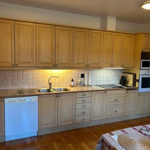 Köksinredning 6000 kr. Bänkskivor i körsbär. Underskåp=2 st 40 skåp, 5 st 60 skåp, 2 st 80 skåp. Överskåp= 2 st 60 skåp, 1 st 80 skåp , 2 st 100 skåp. Högskåp 195 höjd. Nedmonterat.