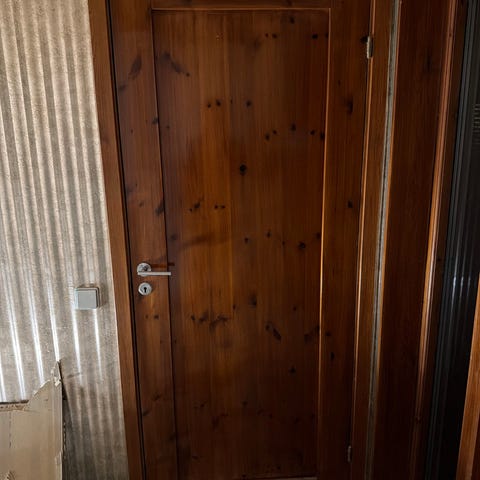 Innerdörr med karm i trä med glaspartier, består av två dörrar med flera glasrutor. Handtag finns ej.