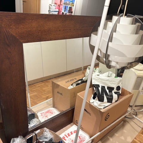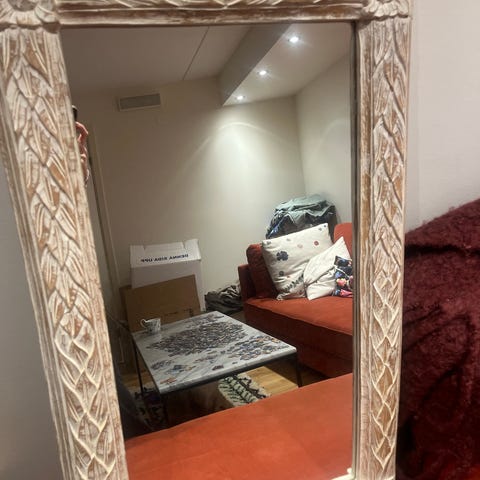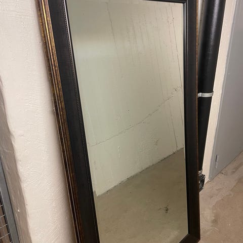 En stor spegel med träram. Baksidan är märkt 'Made in Sweden'.