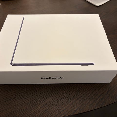 Apple MacBook Air bärbar dator i grå färg. Produkten inkluderar originalförpackning och har en tunn och lätt design. Tangentbord med svarta tangenter och en skärm med svart ram. Enheten har en Apple-logotyp på locket.
