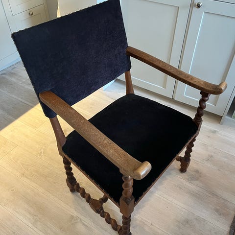 Otroligt pampig fåtölj med fransar. Gammal och med tydligt Brukslitage (ser man till ålder så med perfekt patina).
