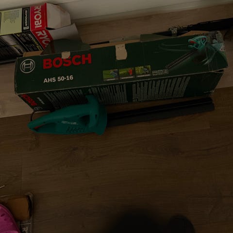 en häcksax med teleskopskaft som möjliggör justerbar längd för att nå högre eller svåråtkomliga områden. Verktyget är batteridrivet och lämpar sig för trädgårdsarbete och beskärning av häckar och buskar.