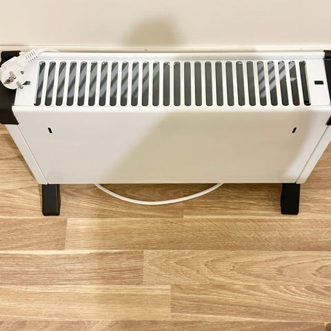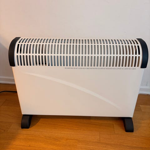 elvärmeelement i vitt och svart med inbyggd termostat och justerbara värmeinställningar. Passar för uppvärmning av mindre till medelstora rum. Utrustad med strömbrytare och värmereglering på sidan.
