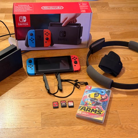 Nintendo Switch (gen 1) konsol i originalförpackning med alla tillbehör. I bra skick. Främst använd i dockat läge. Fabriksåterställd. Enda skadan är att ena "gångjärnet" till luckan på baksidan är trasig (se bild 3).