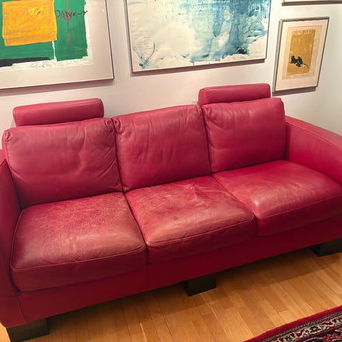 Äldre modell, fin i skicket, inga skador. Rödbrunt läder. Sitthöjd 47 cm, med skruvade ben som är 10 cm högre än ursprungsbenen (som kan medfölja). Sittdjup 54 cm.