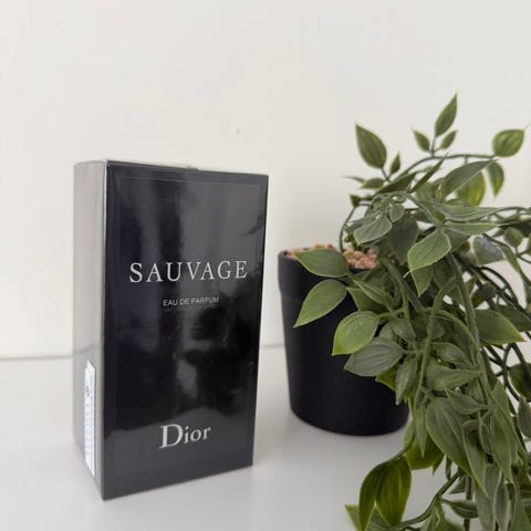 Dior Sauvage Eau de Toilette för män med karakteristisk doft. Flaskan är tillverkad av glas med svart och grå färgton.