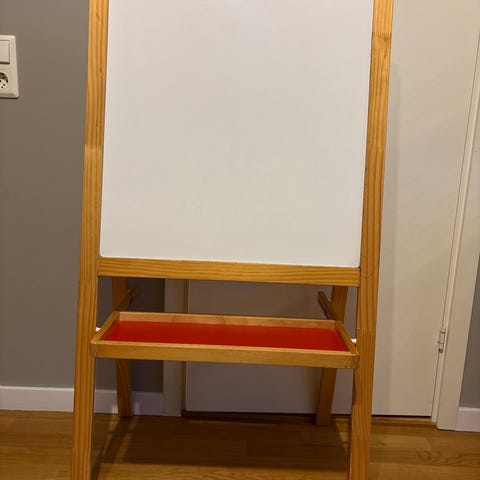 Barnritställning med svart griffeltavla på ena sidan och vit skrivtavla på andra sidan. Tillverkad i trä med röd förvaringshylla under tavlan. Passar för barn att rita och skriva på båda sidorna.