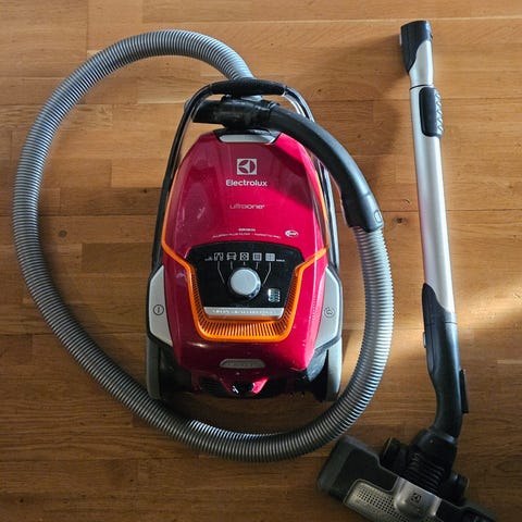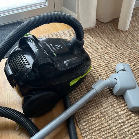 En ny dammsugarpåse finns redan inuti. Dammsugaren fungerar perfekt utan problem. Handtaget hade ett litet hål i plasten – det är lagat och målat. I övrigt i gott skick.