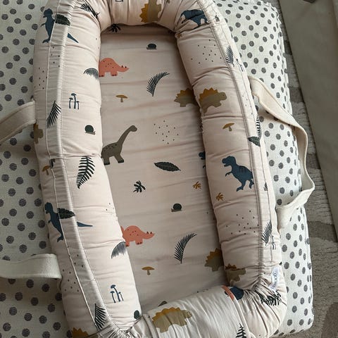 Babynest från Liewood, sparsamt använd. Inköpt av mig från start. Ljusgrå med fruktmönster. Handtag och en träplatta i botten under madrassen vilket gör att man kan lyfta det från en plats till en annan utan att väcka barnet. Finns också ett band runt babynest som kan dras åt/släppas på beroende hur tight man vill ha det runt bebisen.