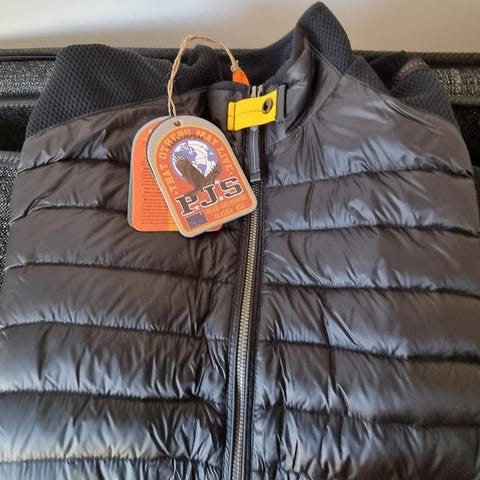 Svart dunväst från Colmar i italiensk strl 46 - europeisk 42. Västen är oversized i modellen. Jag har storlek 36-38 vanligen och den fungerar på mig- men väldigt rymlig. Så beror på hur man vill att den ska sitta.