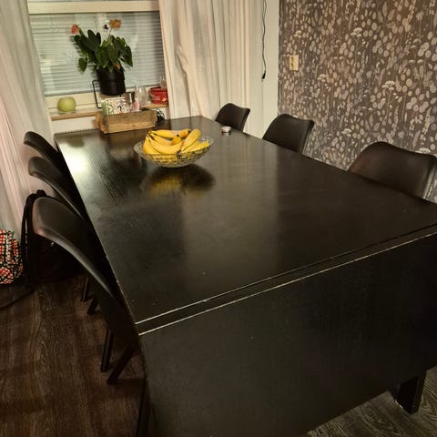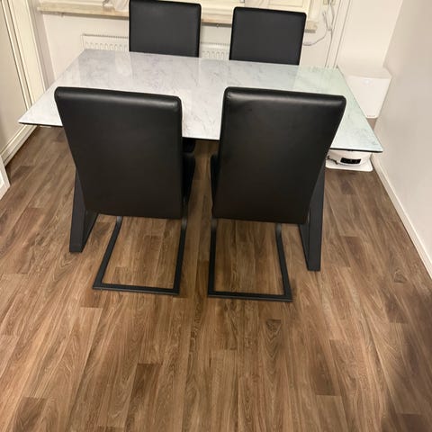 Bord komplet med 6 stolar 5 år gamla, fin skick, med avdragbar stolklädsel och bordet går förlängas till 160 cm, skivan är inbygd , säljs pga flyt.