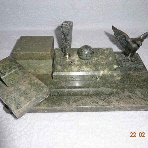 Antikt skrivbordsset i marmor med 5 delar. Tungt set.
