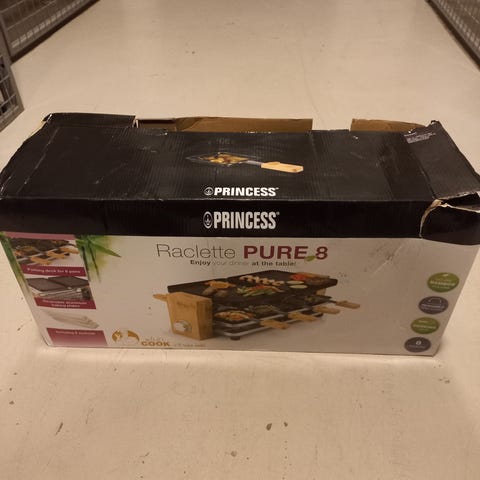 Raclette grill utrustad med en granitsten för matlagning och 8 små pannor för att smälta ost eller tillaga små portioner. Grillen har en justerbar värmekontroll och en underhylla för förvaring. Passar för matlagning vid bordet och sociala tillfällen.